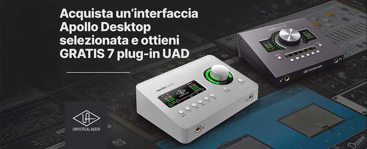 Dal 1° al 31 maggio 2025, acquistando un'interfaccia Universal Audio della serie Apollo Solo o Apollo Twin USB, riceverai in omaggio un pacchetto esclusivo di 7 plug-in UAD professionali!